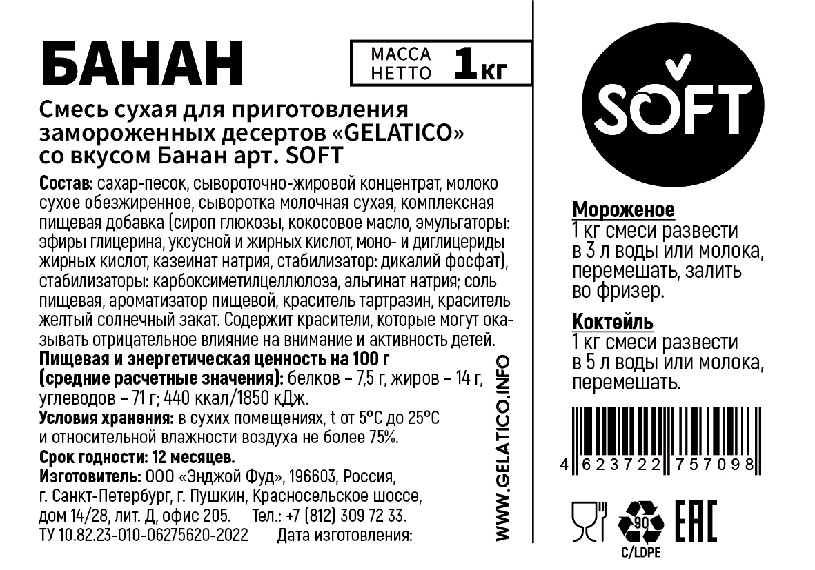 Смесь для мороженого "GELATICO" SOFT "Банан" представляет собой специально разработанную смесь для мороженого и коктейлей на основе сухого молока, премиальных заменителей молочных жиров и других высококачественных ингредиентов.