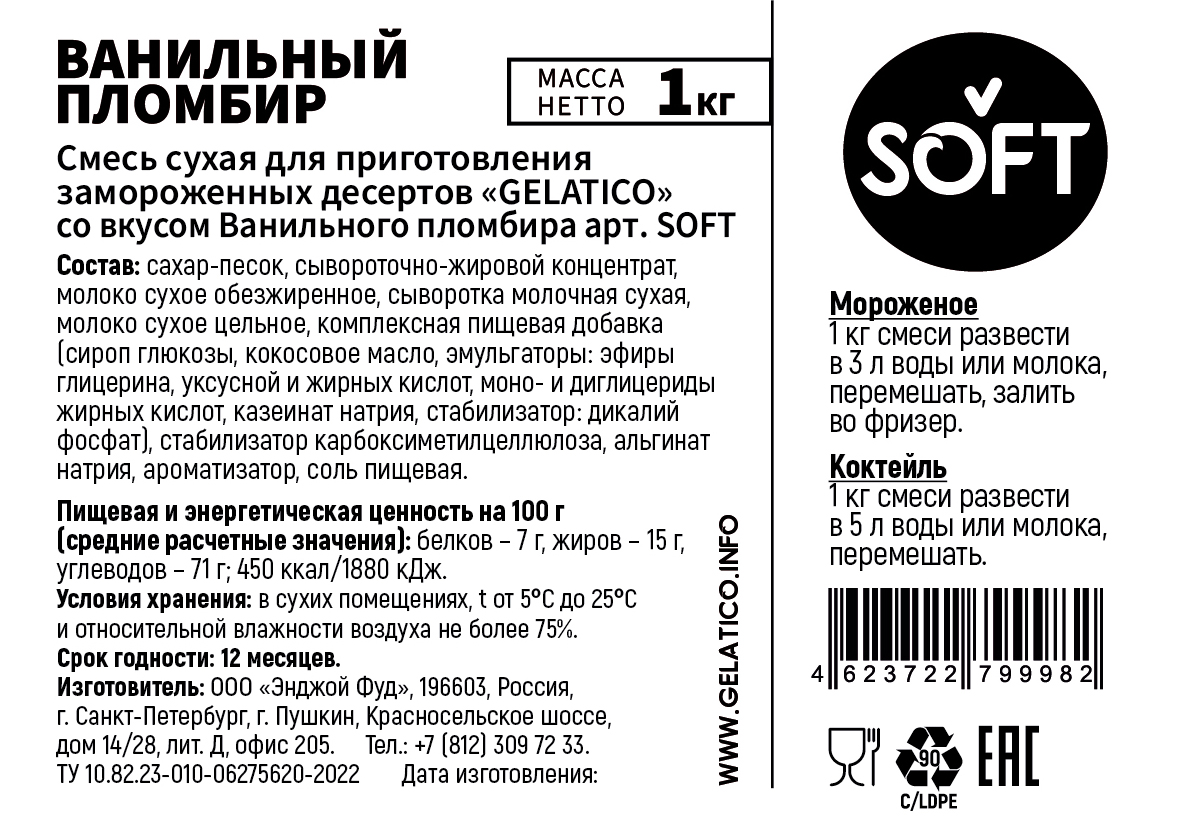 Смесь "GELATICO "SOFT "Ванильный пломбир" обладает ярким, сливочно-пломбирным вкусом с легкой ноткой ванили, нежным белым цветом и приятной кремовой консистенцией.