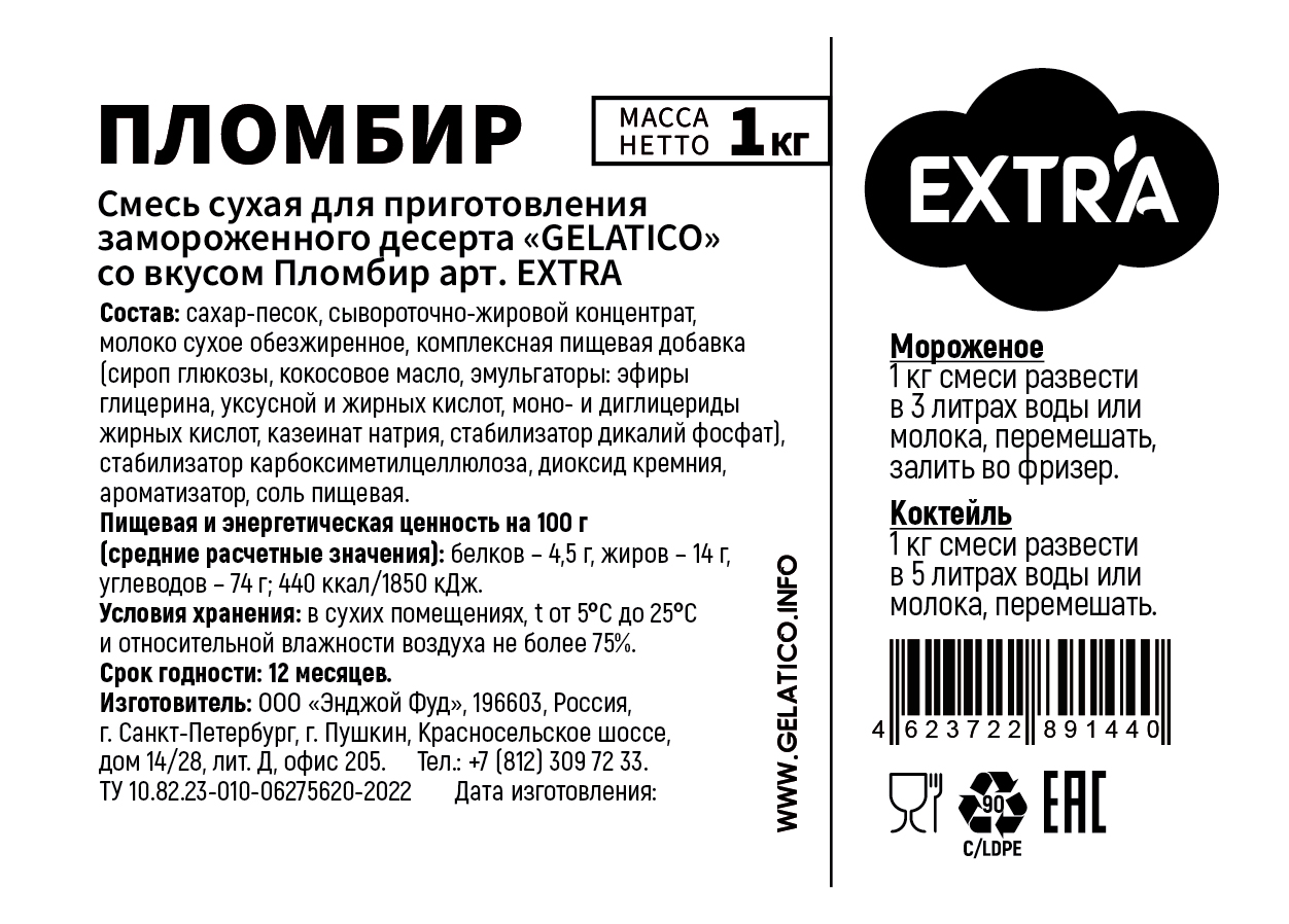 Смесь "GELATICO "EXTRA "Пломбир" представляет собой специально разработанную смесь для мороженого и коктейлей на основе сухого молока, премиальных заменителей молочных жиров и других высококачественных ингредиентов.