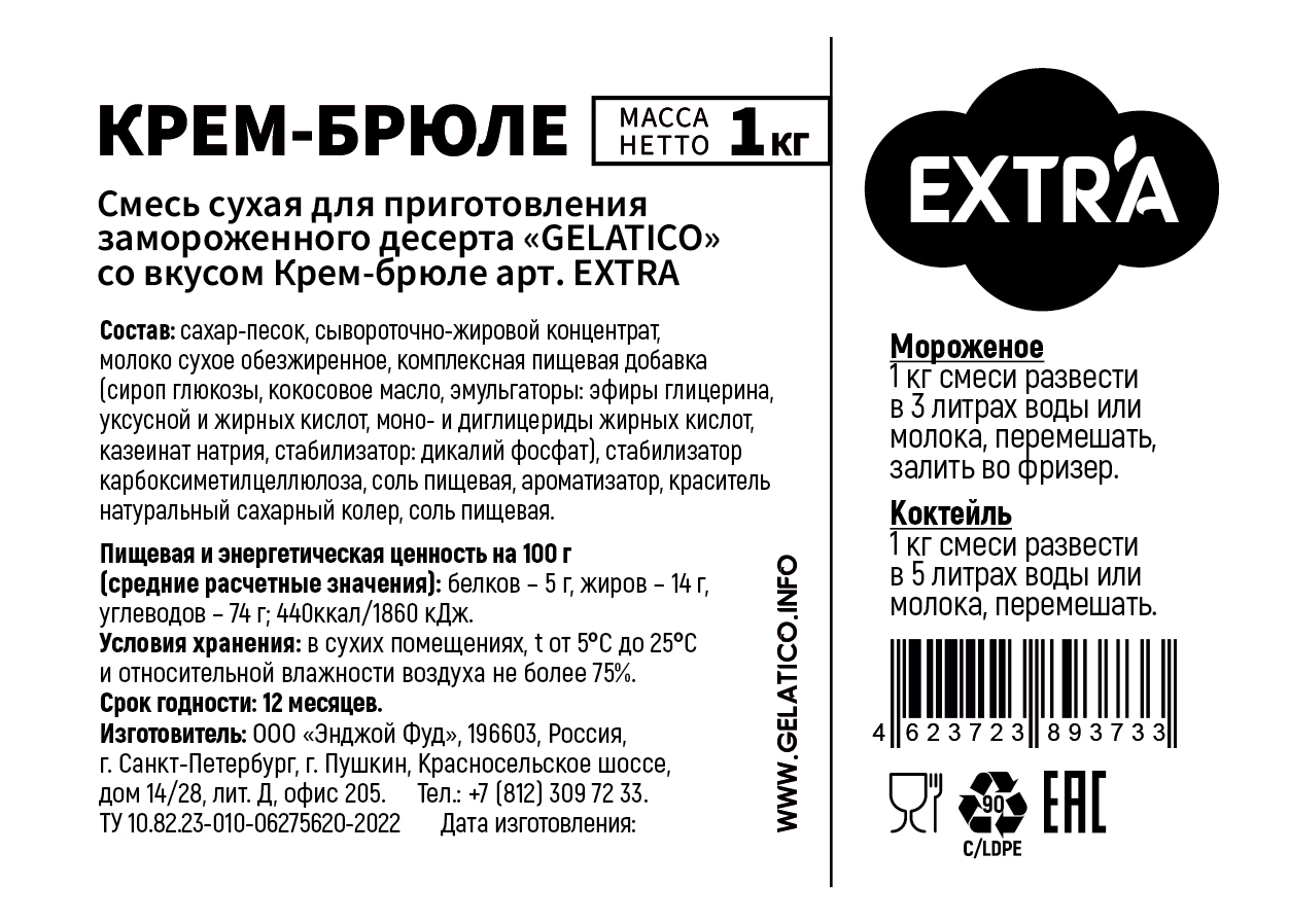 Смесь "GELATICO "EXTRA "Крем-брюле" представляет собой специально разработанную смесь для мороженого и коктейлей на основе сухого молока, премиальных заменителей молочных жиров и других высококачественных ингредиентов.