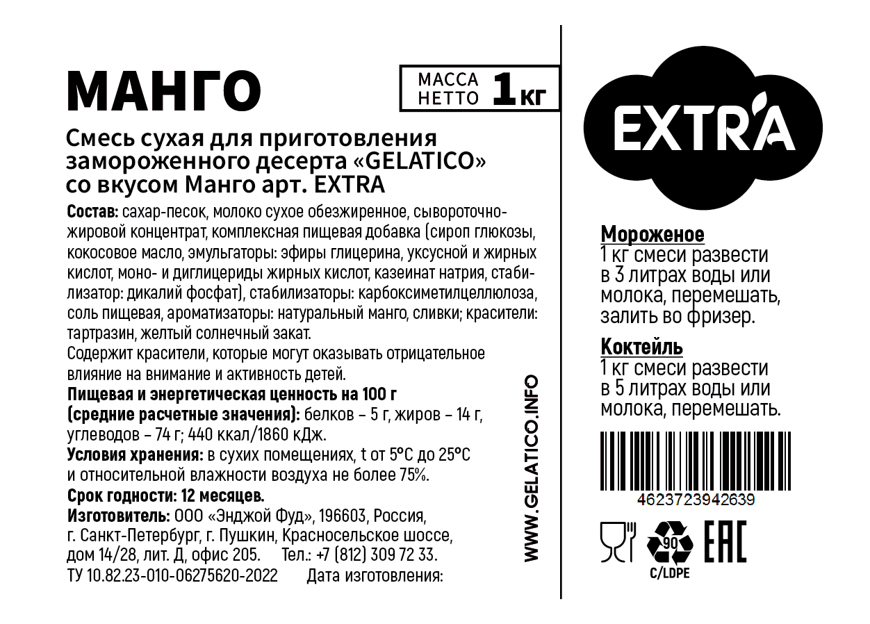 Смесь "GELATICO "EXTRA "Манго" представляет собой специально разработанную смесь для мороженого и коктейлей на основе сухого молока, премиальных заменителей молочных жиров и других высококачественных ингредиентов.