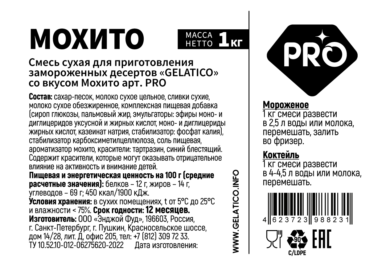 Смесь для мороженого "GELATICO" PRO "Мохито" представляет собой специально разработанную смесь для мороженого на основе цельного сухого молока и других высококачественных ингредиентов. Предназначена для приготовления мягкого мороженого и молочных коктейлей в сети общественного питания на любых типах фризеров.