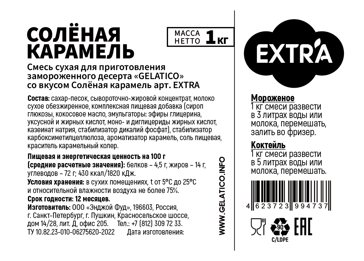 Смесь "GELATICO "EXTRA "Солёная карамель" представляет собой специально разработанную смесь для мороженого и коктейлей на основе сухого молока, премиальных заменителей молочных жиров и других высококачественных ингредиентов.