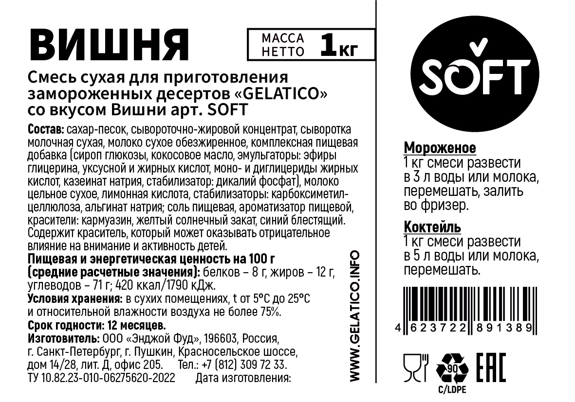 Смесь "GELATICO "SOFT "Вишня" представляет собой специально разработанную смесь для мороженого и коктейлей на основе сухого молока, премиальных заменителей молочных жиров и других высококачественных ингредиентов.