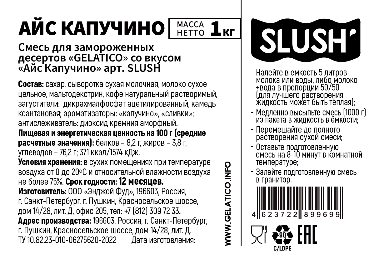 Смесь GELATICO SLUSH "Айс каппучино" представляет собой многокомпонентный продукт из специально подобранных высококачественных ингредиентов, сбалансированных по органолептическим показателям, структуре и консистенции, и гарантирующим стабильно высокое качество готового продукта.
