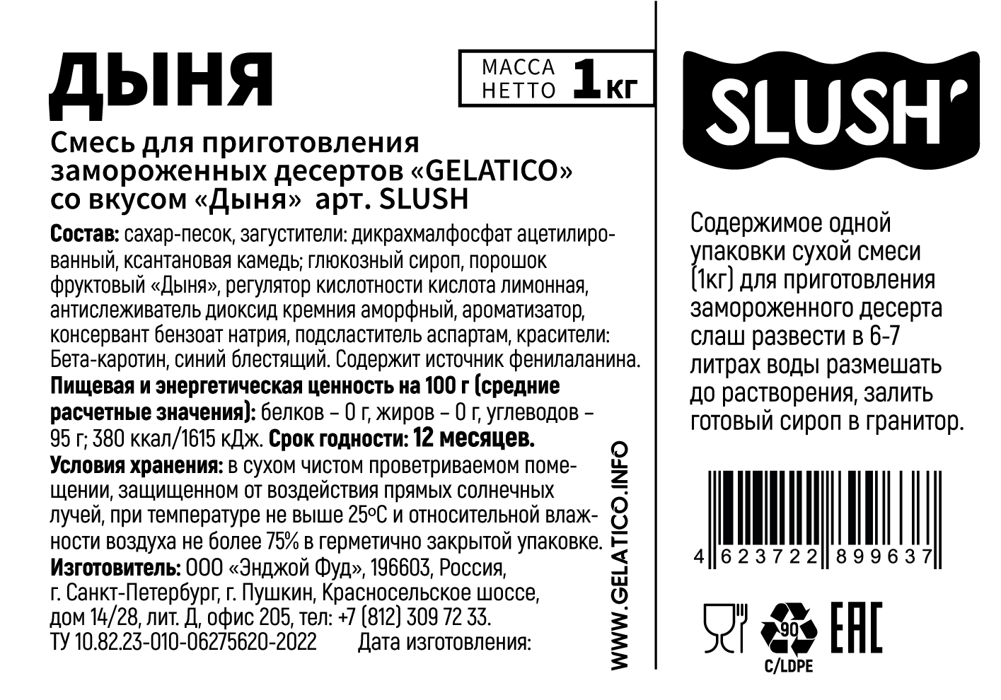 Смесь GELATICO" SLUSH "Дыня" представляет собой многокомпонентный продукт из специально подобранных высококачественных ингредиентов, сбалансированных по органолептическим показателям, структуре и консистенции, и гарантирующим стабильно высокое качество готового продукта.