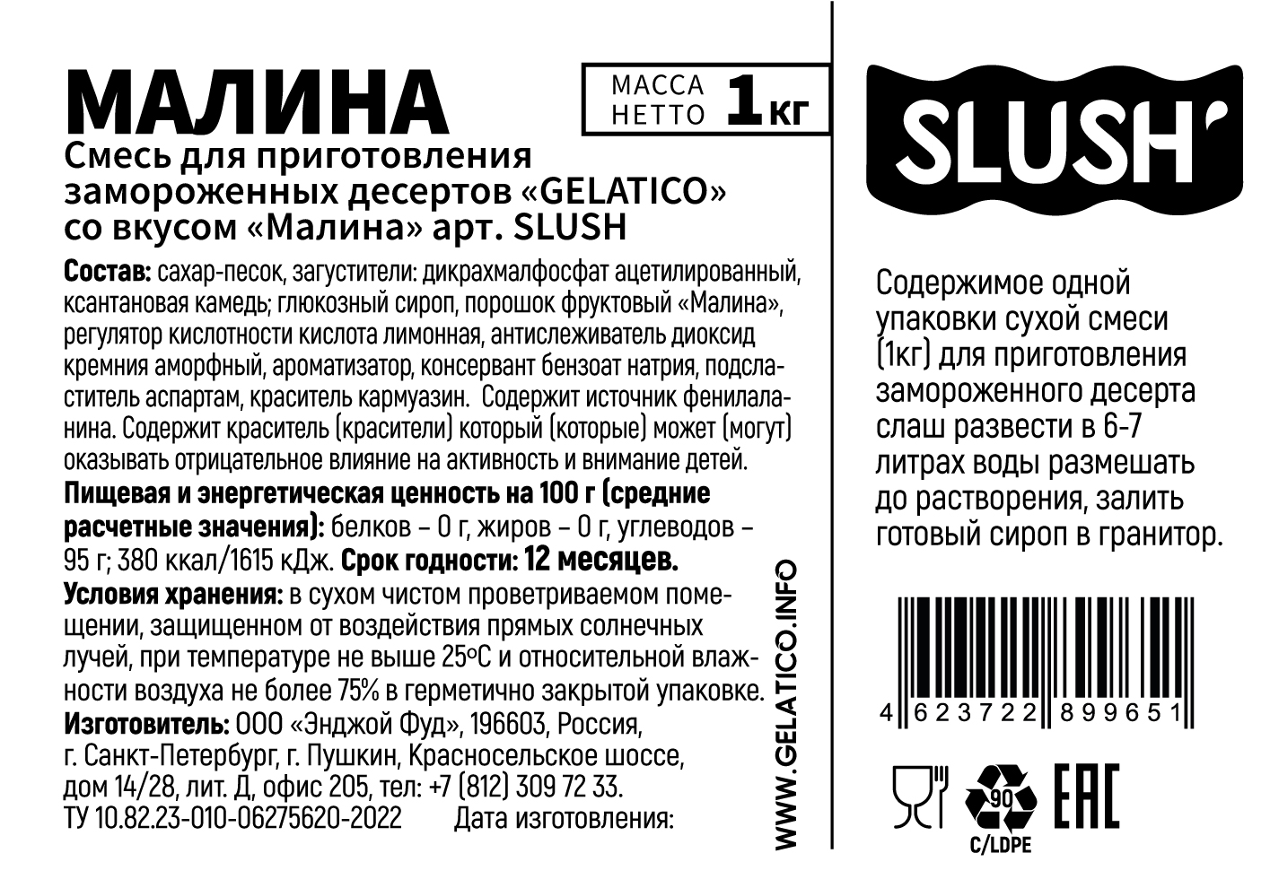 Смесь GELATICO" SLUSH "Малина" представляет собой многокомпонентный продукт из специально подобранных высококачественных ингредиентов, сбалансированных по органолептическим показателям, структуре и консистенции, и гарантирующим стабильно высокое качество готового продукта.